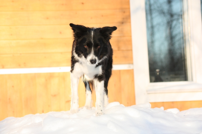 Tänne on tullut hieman lunta ja tuohon kohtaa on vähän kasaantunut lunta. Vaikka meillä on todella korkealla ikkunat niin nyt koirat näkee kasan päältä kyllä vaivatta sisällekkin, jos haluavat.