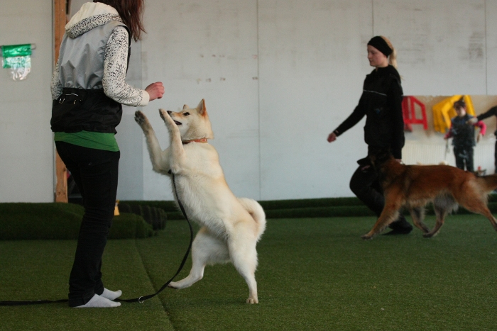 Sitten vaihdoin taas koiraa, eli Pyr pääs treenaan. Seuraaminen meni taas ihan edistämiseksi, muuten teki oikein pätevästi eikä välittänyt ympärillä olevista koirista yhtään. Seuraamisesta jäävätkin teki oikein hyvin. Tässä välissä oli taas ilman käskyn alla olemista ja lähti himmailemaan... Kiersi hallin ympäri menemmättä kenenkään koiran luo ja tuli sitten takasin. Ihan ihme himmailu. Tän jälkeen tehtiin vielä hyppyä ja luoksetuloa oikein pätevästi taas muista välittämättä.