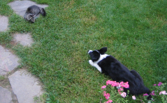 Tuike on aina pelännyt jonkin verran kisoja ja erityisesti pieniä kissanpentuja, vaikkei sille ole ikinä mitään kissojen kanssa sattunut. :D Pentuna Penni (kuvassakin oleva kissa) tykkäsi jahdata Tuikea, joka aina juoksi sitä pakoon. Voitteuskoa sen olevan hyvin hauska näky. Meidän omasta kissasta Tuike ei ole oikeastaab pahemmin välittänyt koskaan, yleensä välttelee sitä hieman tai sitten rohkeasti antaa sille pikaisia pusuja.