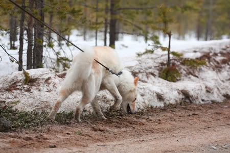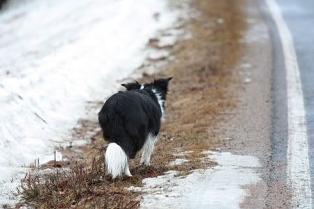 Pyrrin kiskominen ei ehkä ärsytä ihan joka päivä, mutta Tuiken autojen paimentaminen kyllä. Se kyllä tulee jo automaattisesti mun viereen aina auton tullessa ja sitä voi piettää irti, mutta silti, aina on pysähdyttävä kun auto tulee. Kuvasin kuvat jo alkukuusta, että ei täällä enää nuin paljoa ole lunta. Tahdoin kuitenkin miettiä vielä, onko nuo varmasti ne ärsyttävimmät.