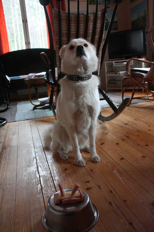 Pyrri pikkuinen täytti tänään jo 7 vuotta! Tuntuu, että se tuli ihan vasta, hetki sitten se oli vielä pieni valkoinen kerä. Toisaalta tuntuu, että se on ollut aina. Hassua. :) Pyrri sai synttärien kunniaksi juustosta ja makkarasta tehdyn kakun, jota Tuikekin sai maistaa.